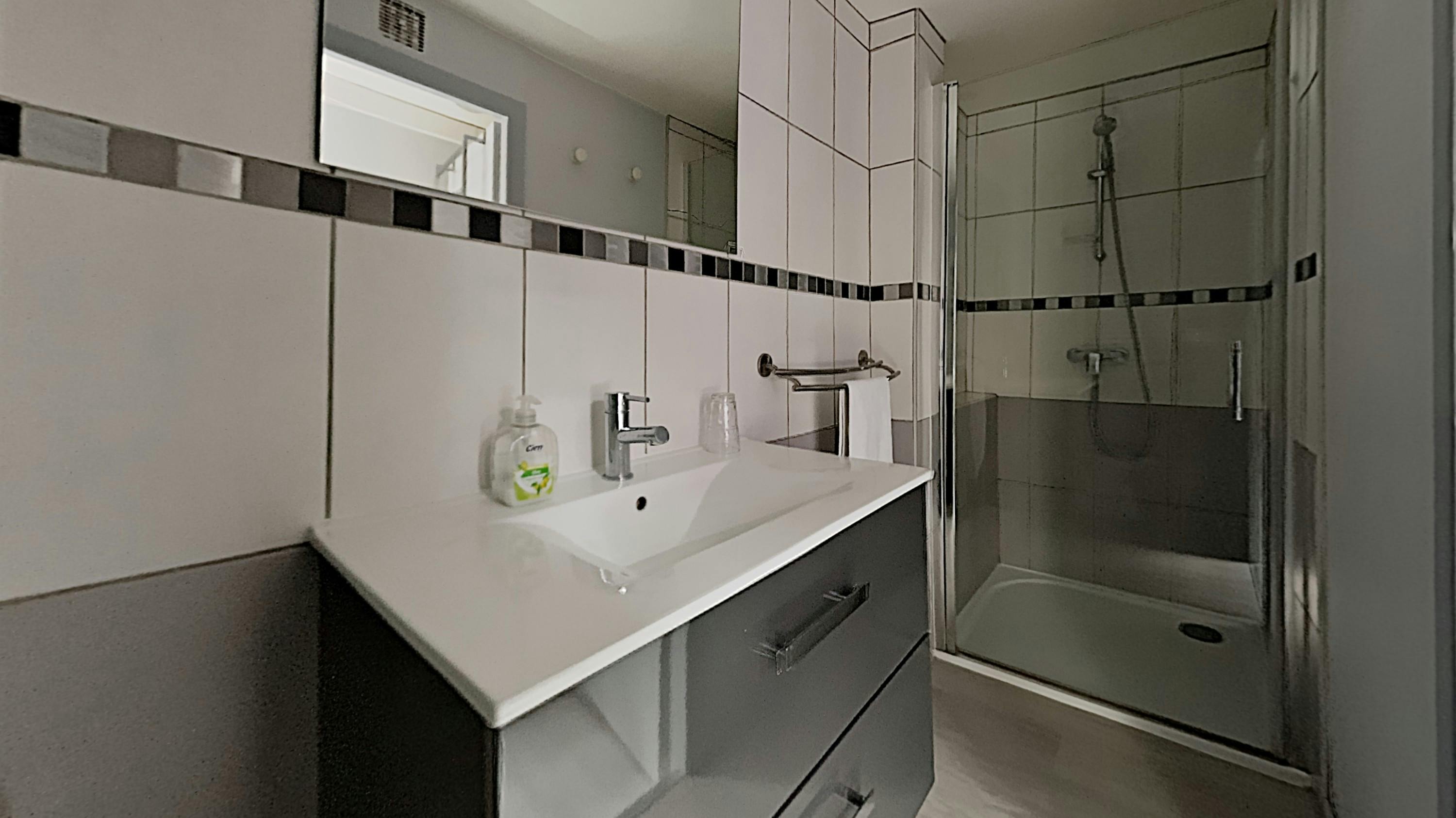 - A bathroom, consisting of a shower, a sink, and a toilet and equipped with a hairdryer.