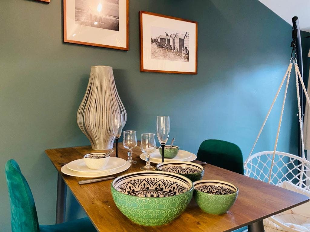 - A dining area with a high table